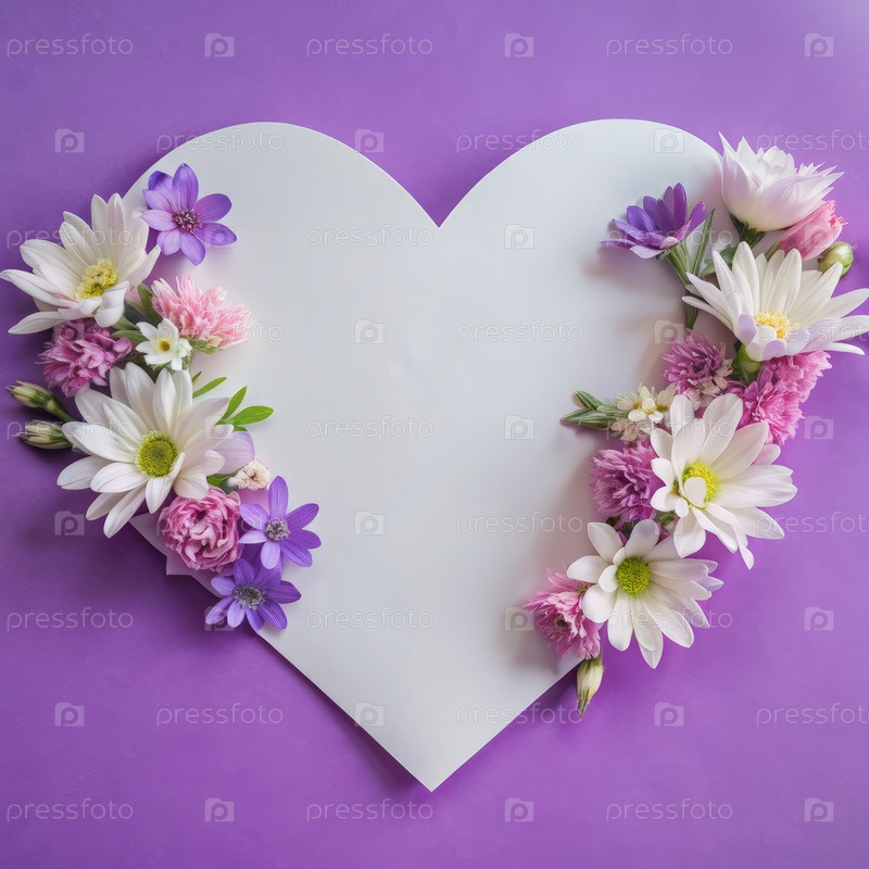 Белая бумага с контуром сердца, украшенным свежими цветами на фиолетовом фоне