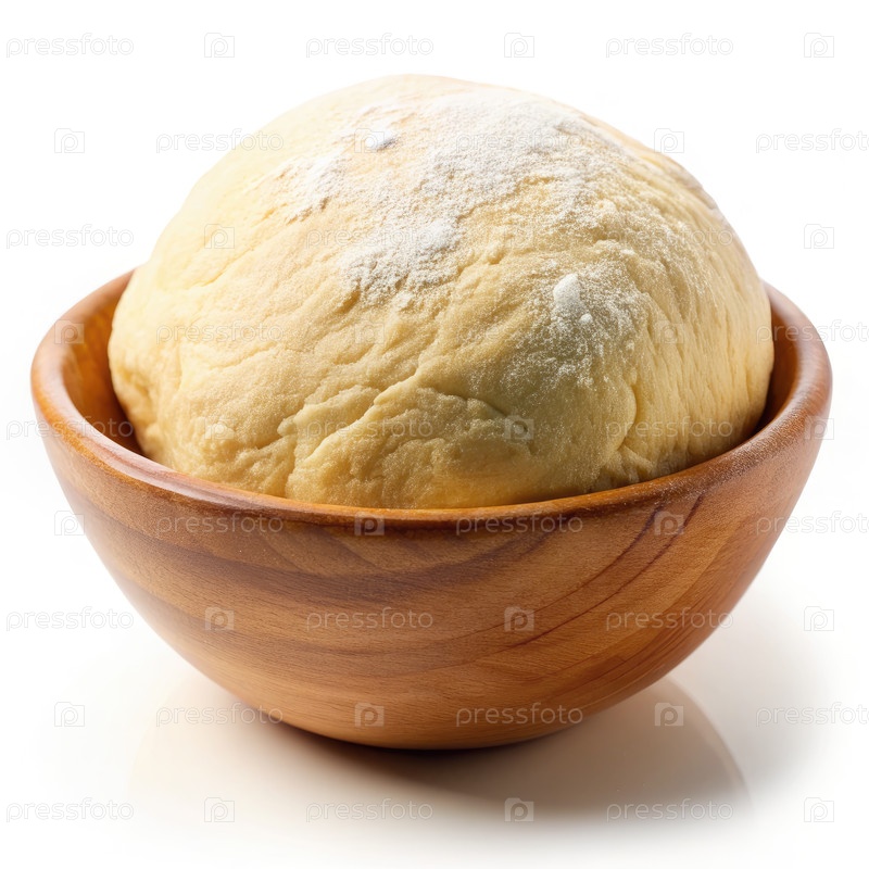 Деревянная чаша, наполненная сырым тестом на белом фоне