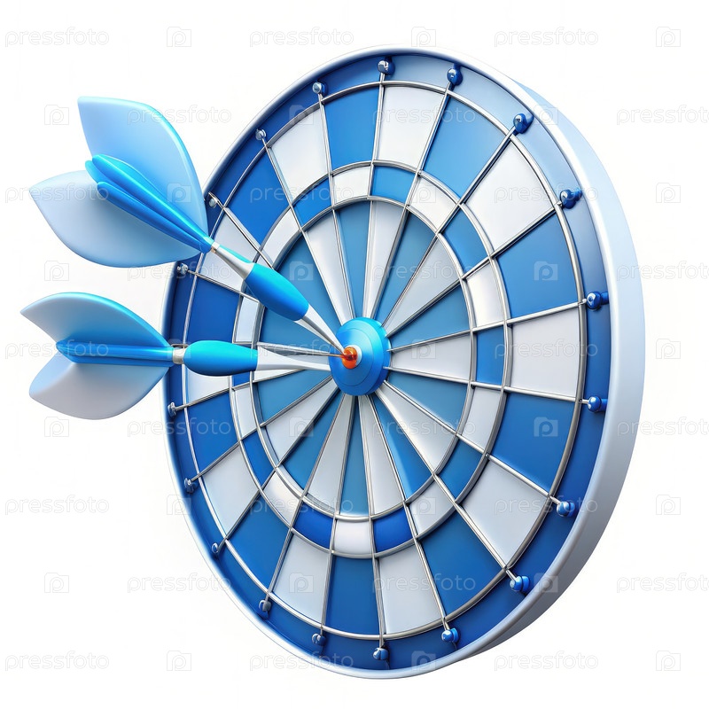 Три голубых дартса, поражающие мишень на бело-синей тартовой доске. генеративный ИИ