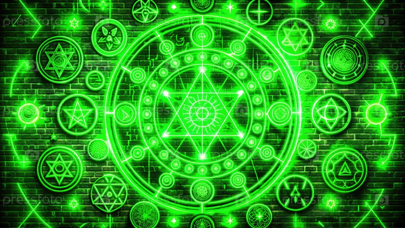 Светящиеся зеленые алхимические символы на кирпичной стене