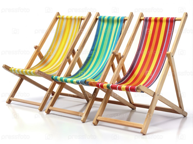 Три красочных полосатых пляжных стула, изолированные на белом фоне