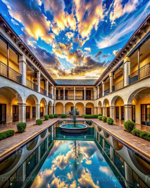 Двойная экспозиция двухэтажного двора с отражающим бассейном на закате