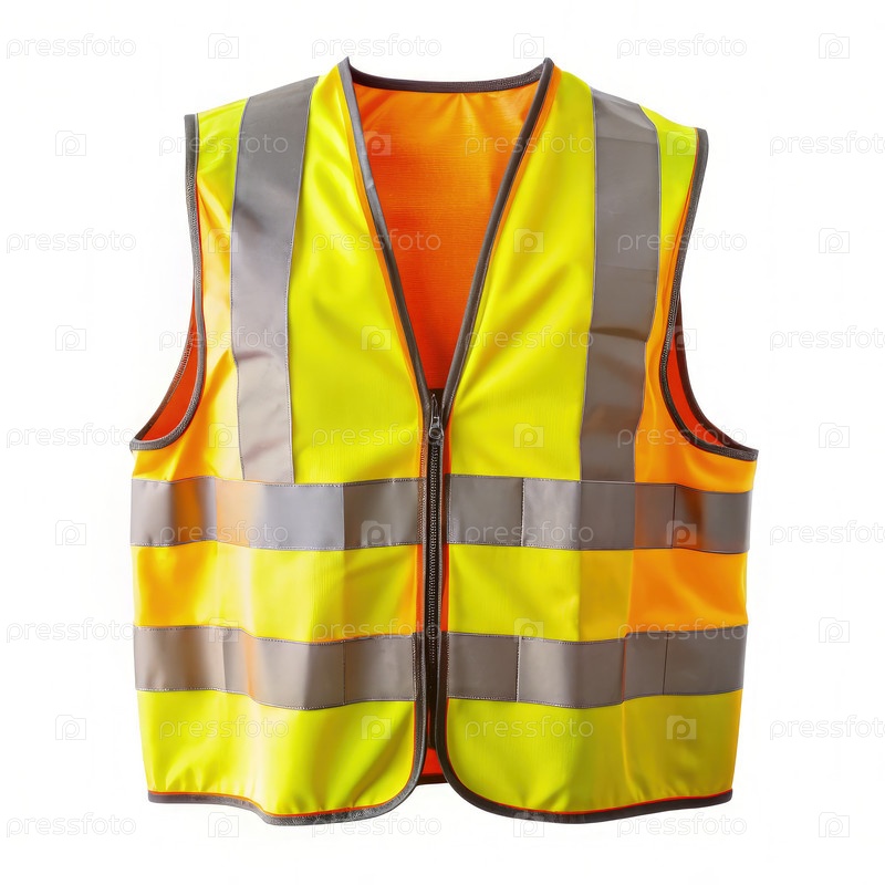 Желтый и оранжевый защитный жилет с отражающими полосками на белом фоне