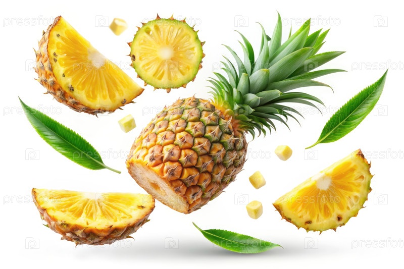 Свежие кусочки ананаса падают в воздухе на белом фоне