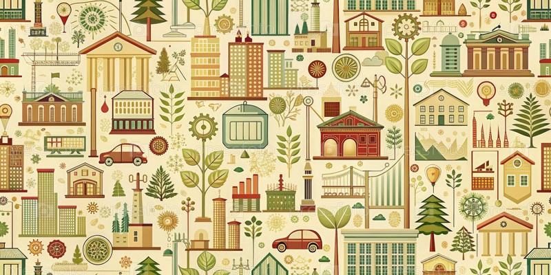 Красочный иллюстрированный шаблон с городским пейзажем со зданиями, транспортом и природой