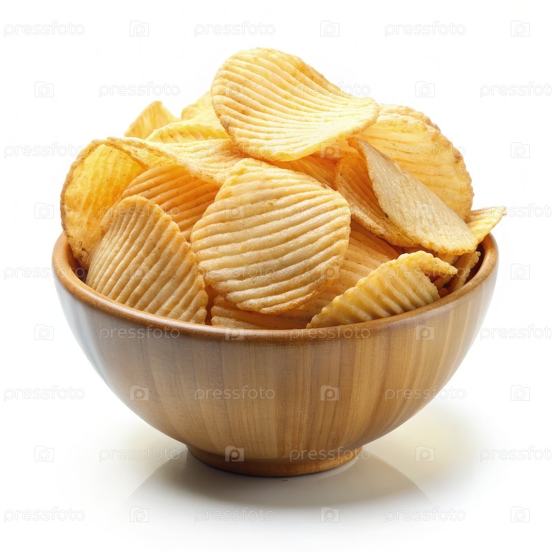 Хрустящие картофельные чипсы в деревянной миске на белом фоне