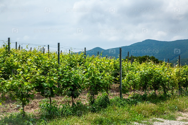 Зеленые лозы в винограднике с горами на заднем плане под облачным небом
