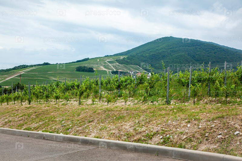 Ландшафт виноградника с зелеными холмами под облачным небом летом