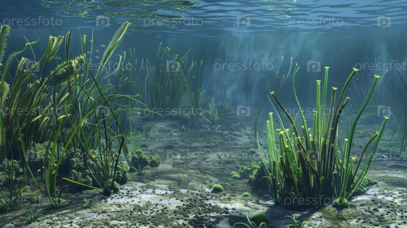 Доисторические водные растения, растущие на древнем морском дне, подводная экосистемная сцена, показывающая морскую эволюцию и естественную биологию
