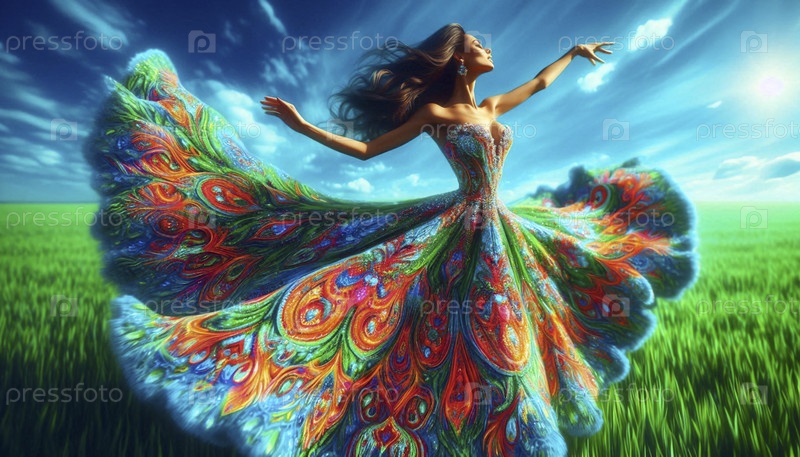 Яркая реклама для новой синтетической ткани, показывающая женщину в красочном платье из пейзли, радостно вращающуюся на поле маргариток, Ai generated image