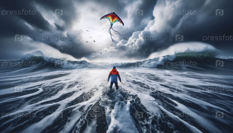 Старик, летящий в традиционном воздушном змее на вершине ветровой скалы с видом на бурное море, его куртка размахивает, Ai generated image