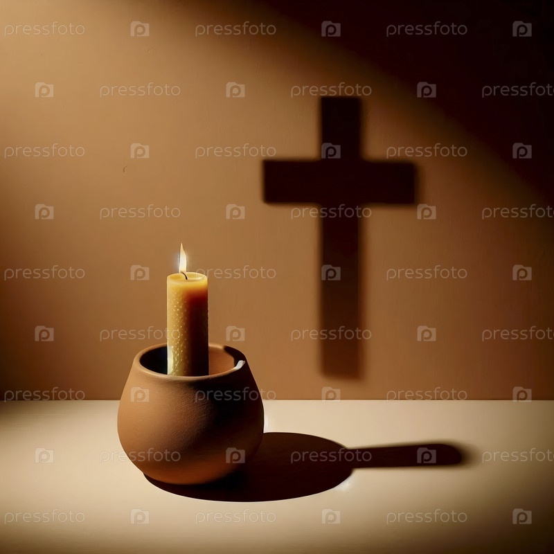 Простая глиняная свеча с деревянной тенью креста, Ai generated image
