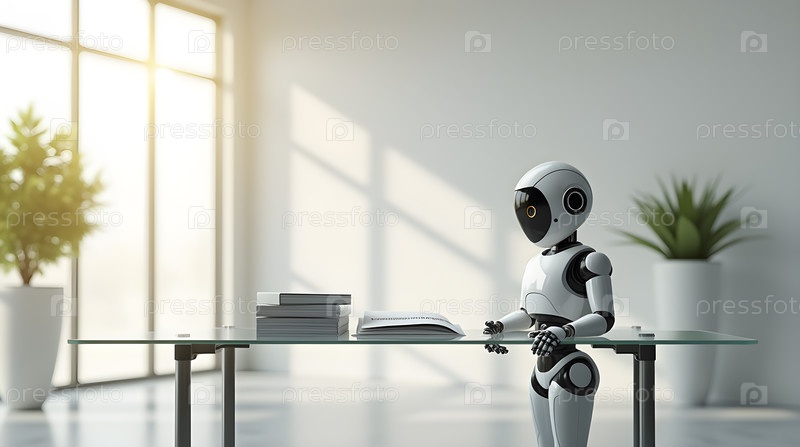 Минималистский офис с помощником-роботом, организующим документы на стеклянном столе, Ai generated image