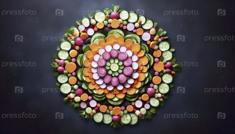 Красочная растительная мандала, созданная из тонко нарезанных редисок, огурцов и морковь, Ai created image