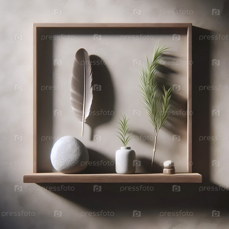 Рустичная полка с камнем, перьями и веточкой розмарина Ai создала изображение