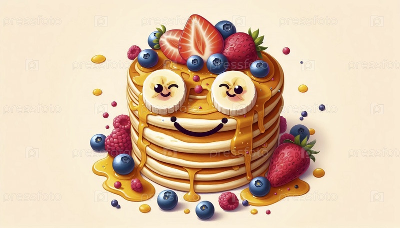 Причудливый стек блинов, украшенный ягодными лицами и улыбками на кусочках бананов, посыпанный сиропом в художественных узорах, Ai created image