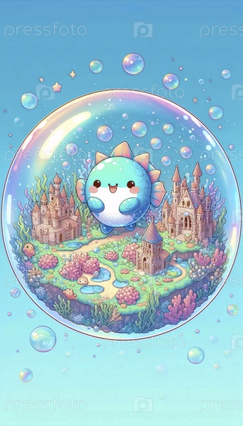 Подробная иллюстрация кавайи подводного города в пузыре, Ai generated image