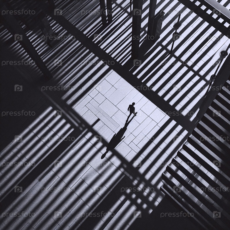 Одинокая фигура в шляпе с широкими краями, идущая по коридору ярких, повторяющихся теней из перголы, Ай создала образ