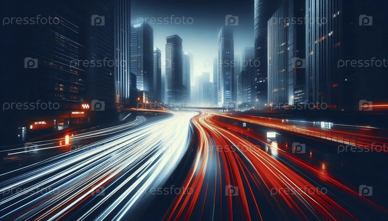 Долгая экспозиция световых путей автомобилей на влажном городском эстакаде ночью, с горизонтом, светящимся в фоне под капризным облачным небом, Ai создала изображение
