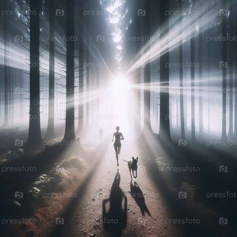 Женщина, бегущая со своей собакой по лесной тропе, окутанной густым эфирным утренним туманом с лучами солнца, фильтрующимися через навес