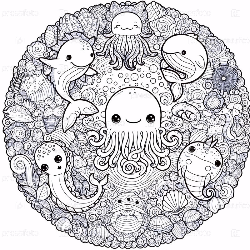 A kawaii ocean creatures цветная страница в круговом формате, Ai generated image