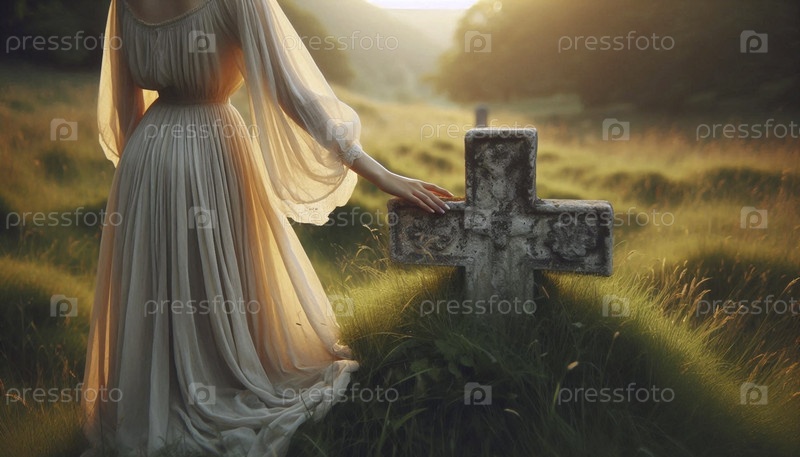 Фигура сзади, касающаяся выветрившийся каменный крест в поле, Ai generated image