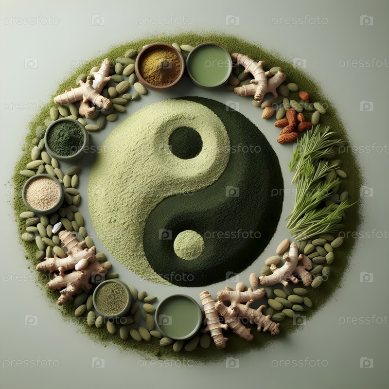 Символ Инь-Ян, сформированный порошком матча и корнем ашваганды, Ai created image