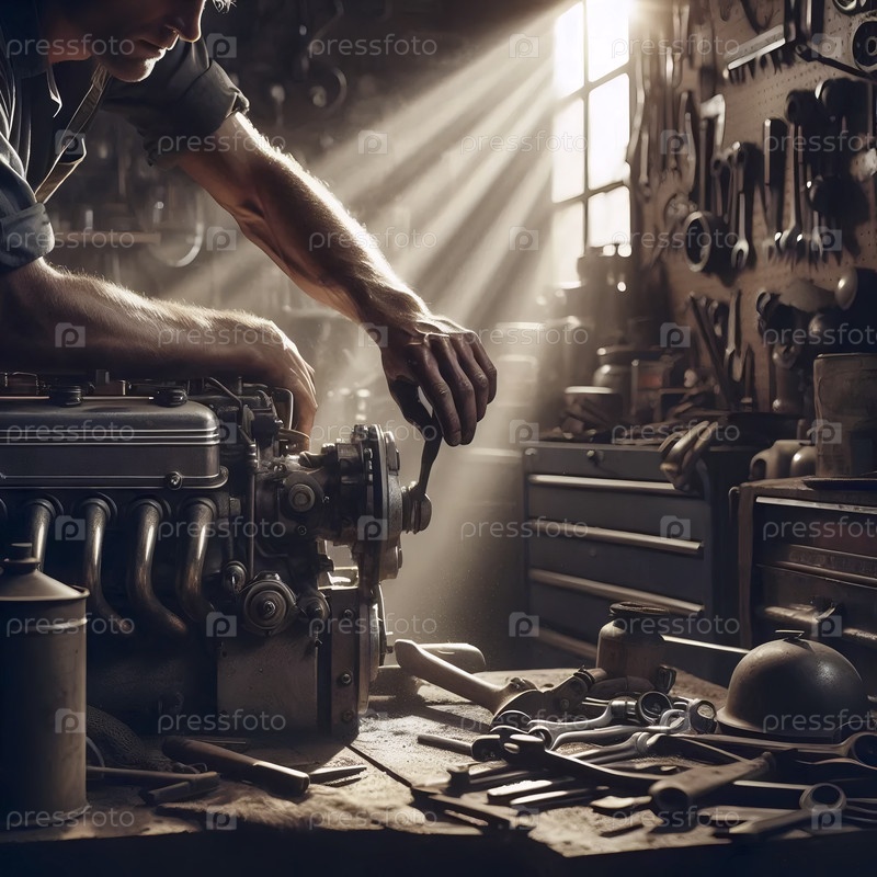 Механик, работающий под поднятым капотом классического автомобиля в пыльном солнечном гараже с разбросанными инструментами и лучами света, прорезающими воздух, создал изображение Ай