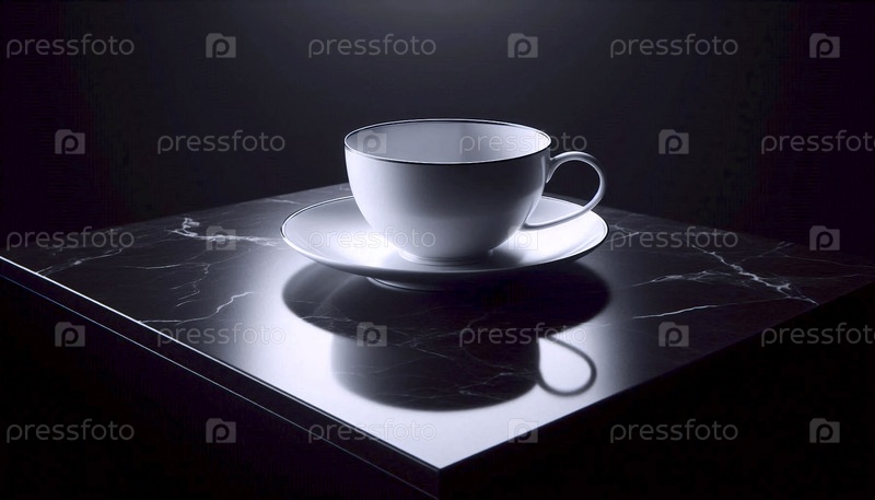 Продуктовый снимок минималистической фарфоровой чайной чашки на поверхности черного мрамора, сосредоточьтесь на идеальном обочине и ручке, Ai generated image