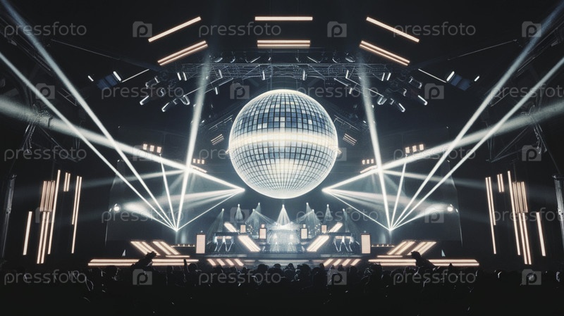 Сцена в ночном клубе с одним гигантским дискотечным шаром, отражающим красочные лазерные лучи во всех направлениях, Ai generated image