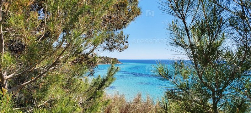 Вид на морскую воду через хвойные сосны, красота в природе