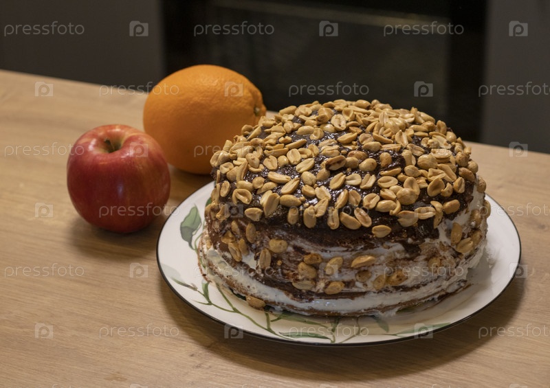 Многослойный торт, покрытый шоколадной глазуркой и наполненный большим количеством жареного арахиса