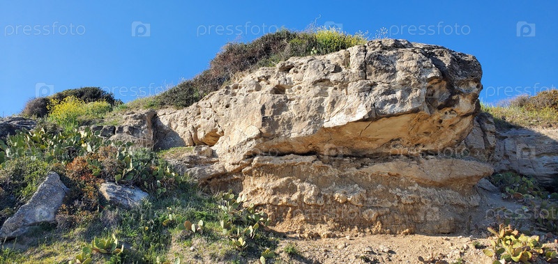 Нижний вид на крутые скалы, каменный выступ и растущие кактусы вдоль краев. красота природы. место назначения для путешествий, походов и романтических вечеров