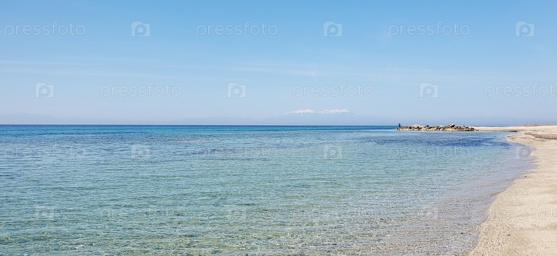 Красивый морской пейзаж. чистая, прозрачная бирюзовая вода и маленькие волны под голубым небом. галечный или песчаный пляж для летних каникул. место назначения для путешествий во время отпуска или отпусков. рай на земле
