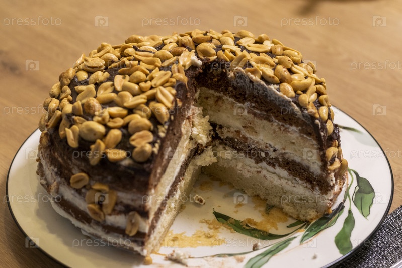 Домашний слоистый шоколадный торт, похожий на пирог в стиле Snickers, с несколькими слоями губки и сливки, покрытых щедрым количеством жареного арахиса