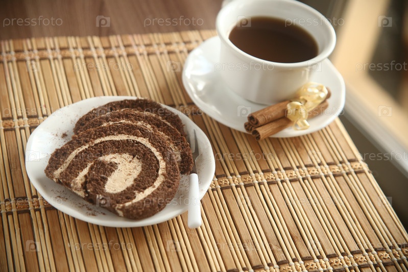 Вкусный шоколадный рулет с кофе и корицей на столе