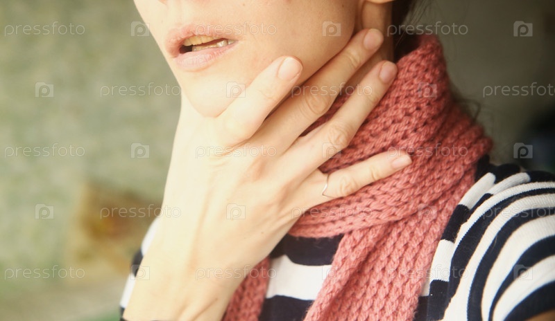 Женщина с держит рукой горло в шарфе с признаками Коронавирусной инфекции. Проблема заболеваний