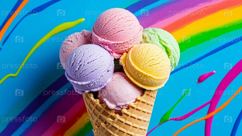 Мороженное крупный план. Вафельный рожок с шариками фруктового мороженного. Яркое вкусное мороженное на красочном фоне