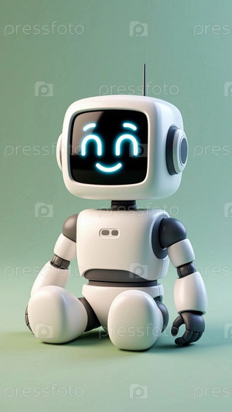 Симпатичный маленький робот сидит. Дружелюбный ИИ-робот на нейтральном фоне Концепция обслуживания клиентов, технической поддержки, искусственного интеллекта и автоматизации