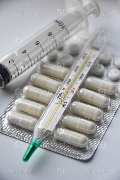 Термометр крупный план с высокой температурой, повышенной температурой на белом фоне. Измерение температуры или лихорадки термометром. Лекарства, таблетки и шприц на столе. Концепция здоровья и медицины