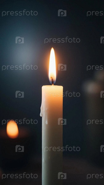 Зажженная свеча горит на темном фоне. огонь, свеча крупный план. одна горящая свеча изолирована с черным фоном