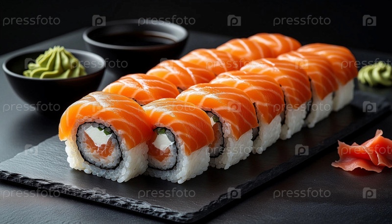 Вкусный набор аппетитных суши-роллов с красной рыбой, васаби, имбирем и соевым соусом. Суши-роллы крупный план. Роллы суши на темном фоне
