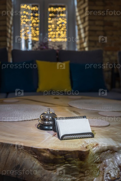 Колокол приемной и держатель визитной карточки на деревянном столе