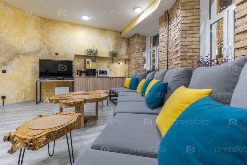 Просторный гостиничный салон с длинным серым диваном с красочными подушками, стенами из промышленных кирпичей и дизайнерскими современными кофейными столами.Интерьер включает в себя телевизионную зону и кухню с кофемашиной.Современный функциональный дизай
