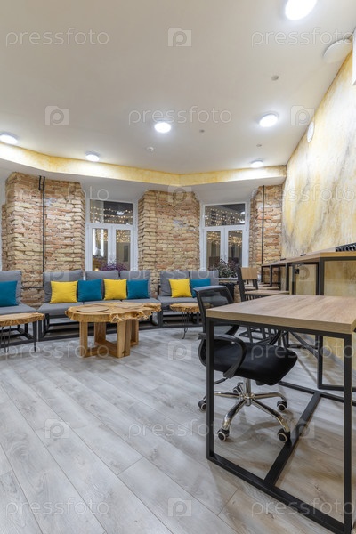 Современный интерьер хостела с коворкинг-зоной с современным столом и офисным креслом на переднем плане.На заднем фоне видна уютная гостиная с серыми диванами, красочными подушками, кирпичными стенами и деревянными столами под яркими потолочными огнями