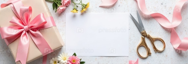 На столе находятся упакованный подарок с розовым луком, цветами, ножницами, лентой и пустым белым листом со копировальным пространством
