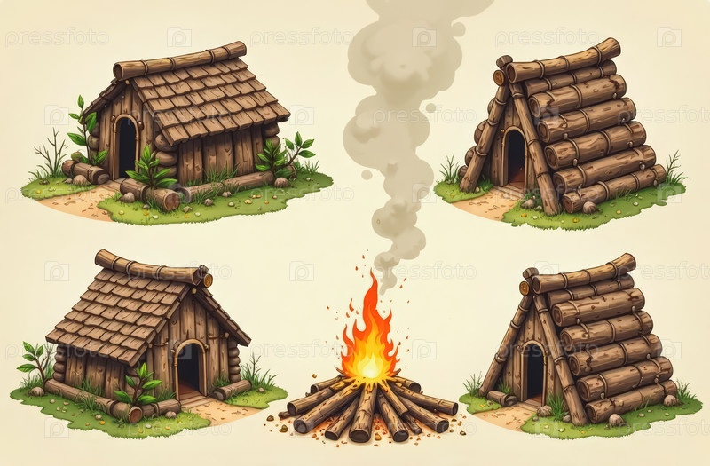 Варианты деревянных домов на зеленой траве, горящий костер в форме звезды с дымом