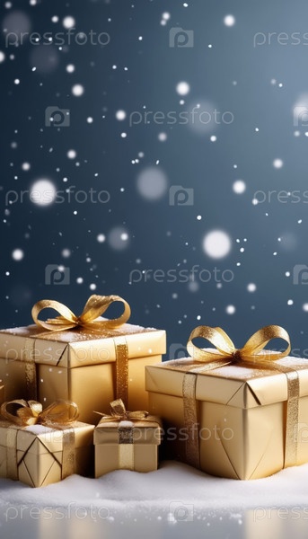 Золотые коробки для подарков на голубом снежном рождественском фоне