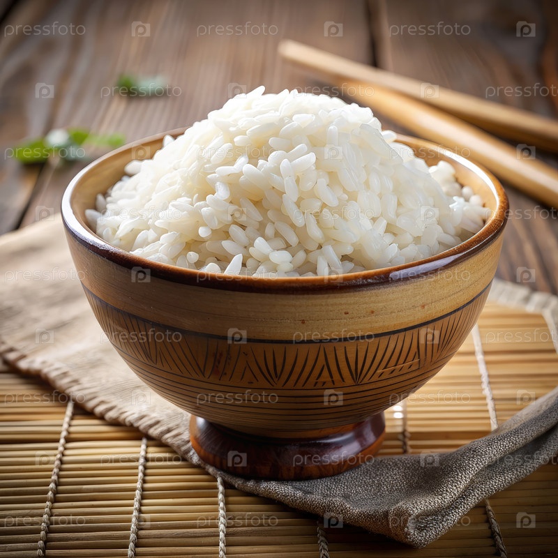 Чаша с приготовленным белым рисом на бамбуковом плацемате