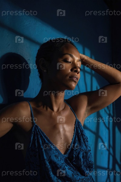 Женщина, опирающаяся на голубую стену в драматическом свете